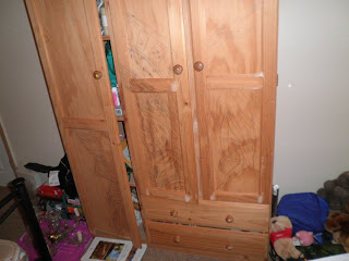 We are tightening our budget at the moment, and were in need of a storage cupboard. Since I had all the insperations from the other sites, I decided to take the poor neglected wardrobe the previous owners left behind. She was timid and badly abused from the constant Greylead drawing attacks they did to her.